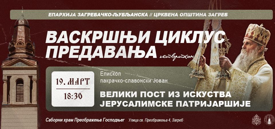 У четвртак, 19. марта 2026. године, предавање ће одржати Његово Преосвештенство Епископ пакрачко-славонски г. Јован, на тему: „Велики пост из искуства Јерусалимске патријаршије“.