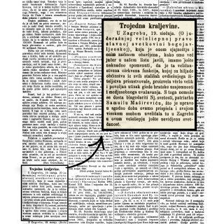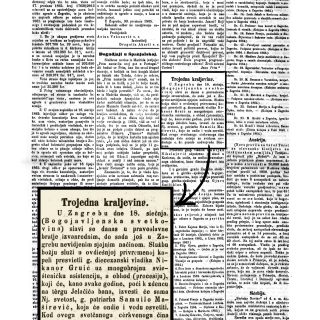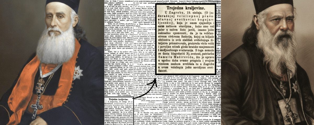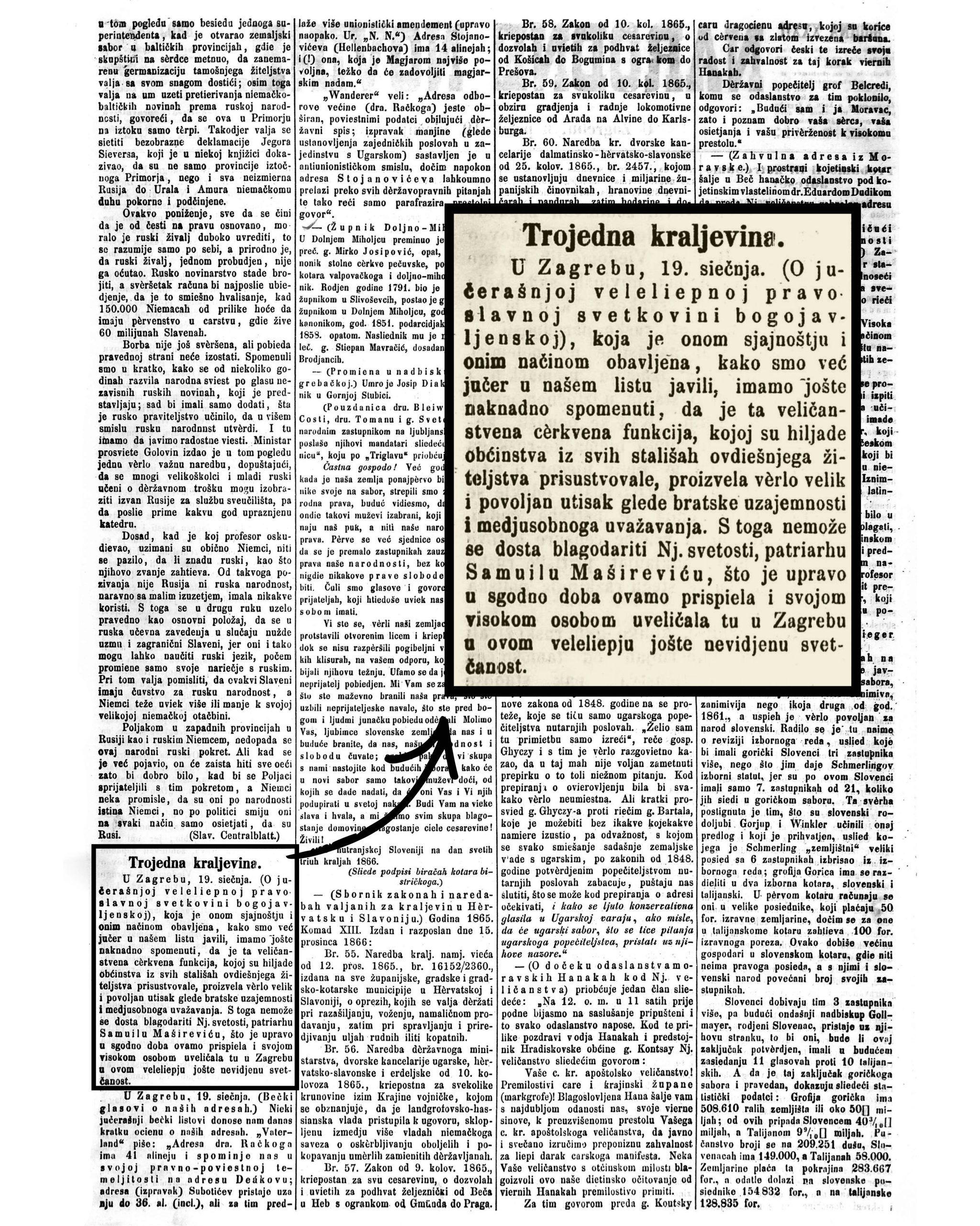 „U Zagrebu, 19. siečnja. (O jučerašnjoj veleliepnoj pravoslavnoj svetkovini bogojavljenskoj), koja je onom sjajnoštju i onim načinom obavljena, kako smo već jučer u našem listu javili, imamo jošte naknadno spomenuti, da je ta veličanstvena cèrkvena funkcija, kojoj su hiljade obćinstva iz svih stališah ovdiešnjega žiteljstva prisustvovale, proizvela vèrlo velik i povoljan utisak glede bratske uzajemnosti i međusobnoga uvažavanja. S toga nemože se dosta blagodariti Nj. svetosti, patriarhu Samuilu Mašireviću, što je upravo u sgodno doba ovamo prispiela i svojom visokom osobom uveličala tu u Zagrebu u ovom veleliepju jošte neviđenu svetčanost.“
