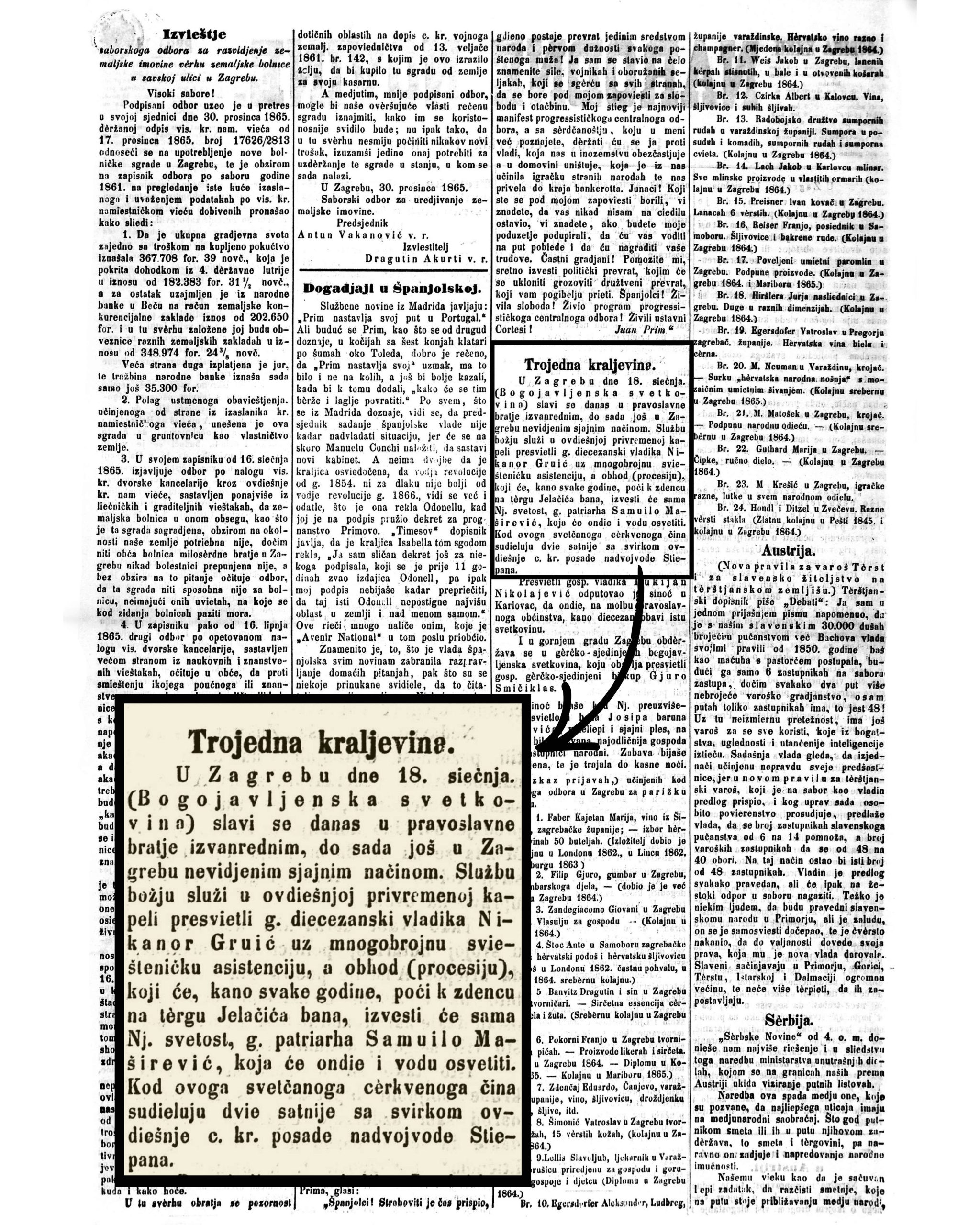 „U Zagrebu dne 18. siečnja. (Bogojavljenska svetkovina) slavi se danas u pravoslavne bratje izvanrednim, do sada još u Zagrebu neviđenim sjajnim načinom… Obhod (procesiju), koji će, kano svake godine, poći k zdencu na tèrgu Jelačića bana, izvesti će sama Nj. svetost, g. patriarha Samuilo Maširević, koja će ondje i vodu osvetiti.“