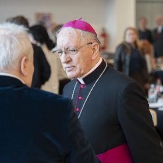 Присутнима се потом обратио пожешки бискуп у миру, монс. Антун Шкворчевић, истакавши да овакви сусрети свједоче о заједничкој одговорности вјерника да у савременом свијету чувају и свједоче оно што је истински људско. У свом обраћању говорио је о Рођењу Христовом као догађају у којем се Бог „одважио бити човјек“, нагласивши да Божић поставља темељно питање савременом човјеку – како остати човјек у свијету обиљеженом подјелама. Истакао је да Божић позива вјернике да, упркос свему што је нељудско у савременом свијету, гледају у Исуса Христа и у Њему пронађу не само инспирацију, него и снагу како бити човјек, и то не у било каквој мјери, већ по оној Божијој коју нам је очитовао у Исусу Христу. Захвалио је епископу Кирилу на позиву и гостопримству те упутио окупљенима божићне и новогодишње честитке.