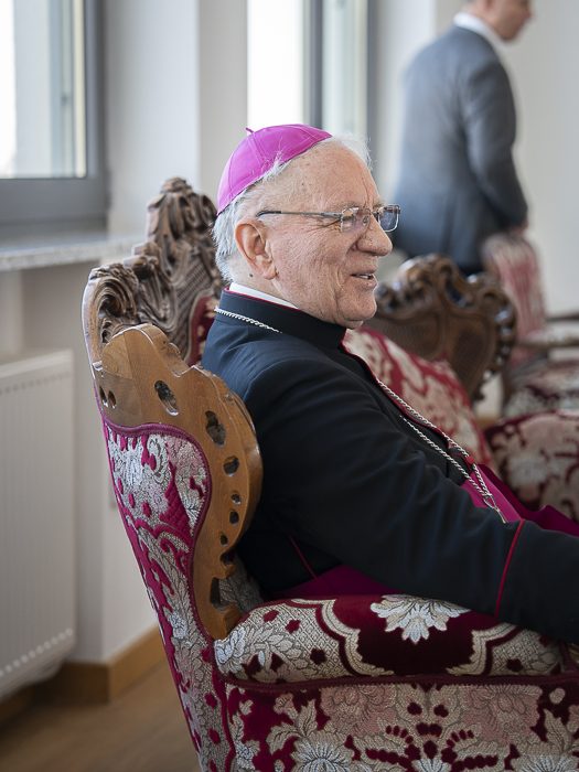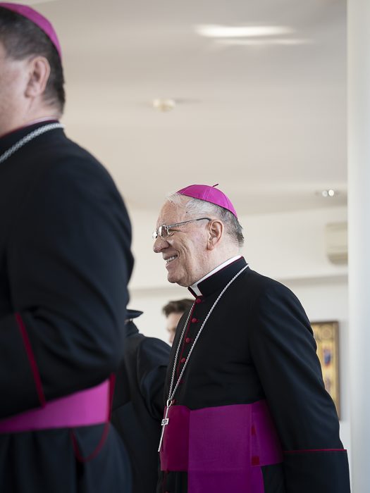 Присутнима се потом обратио пожешки бискуп у миру, монс. Антун Шкворчевић, истакавши да овакви сусрети свједоче о заједничкој одговорности вјерника да у савременом свијету чувају и свједоче оно што је истински људско. У свом обраћању говорио је о Рођењу Христовом као догађају у којем се Бог „одважио бити човјек“, нагласивши да Божић поставља темељно питање савременом човјеку – како остати човјек у свијету обиљеженом подјелама. Истакао је да Божић позива вјернике да, упркос свему што је нељудско у савременом свијету, гледају у Исуса Христа и у Њему пронађу не само инспирацију, него и снагу како бити човјек, и то не у било каквој мјери, већ по оној Божијој коју нам је очитовао у Исусу Христу. Захвалио је епископу Кирилу на позиву и гостопримству те упутио окупљенима божићне и новогодишње честитке.