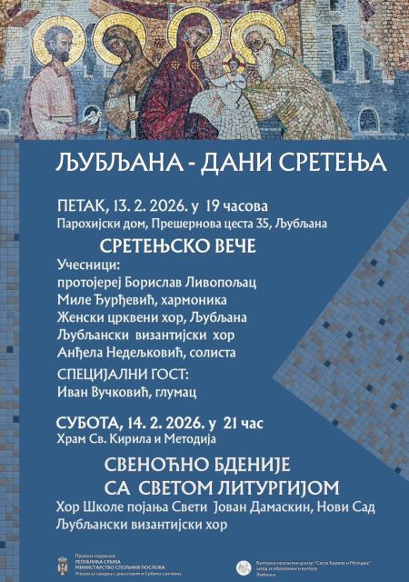 Манифестација Дани Сретења у организацији Црквене општине у Љубљани и Култруно-просветног центра Свети Кирило и Методије одвијаће се захваљујући подршци Управе за сарадњу са дијаспором и Србима у региону Министарства спољних послова Републике Србије.