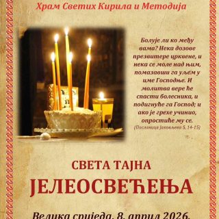 Обавјештавамо вјерни народ да ће на Велику сриједу, 8. априла, са почетком у 17 часова, у храму Светих Кирила и Методија у Љубљани бити служена Света тајна јелеосвећења.